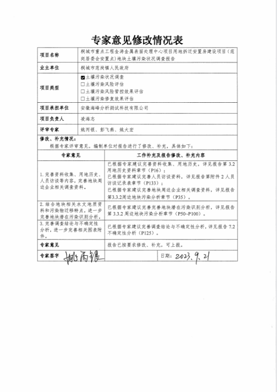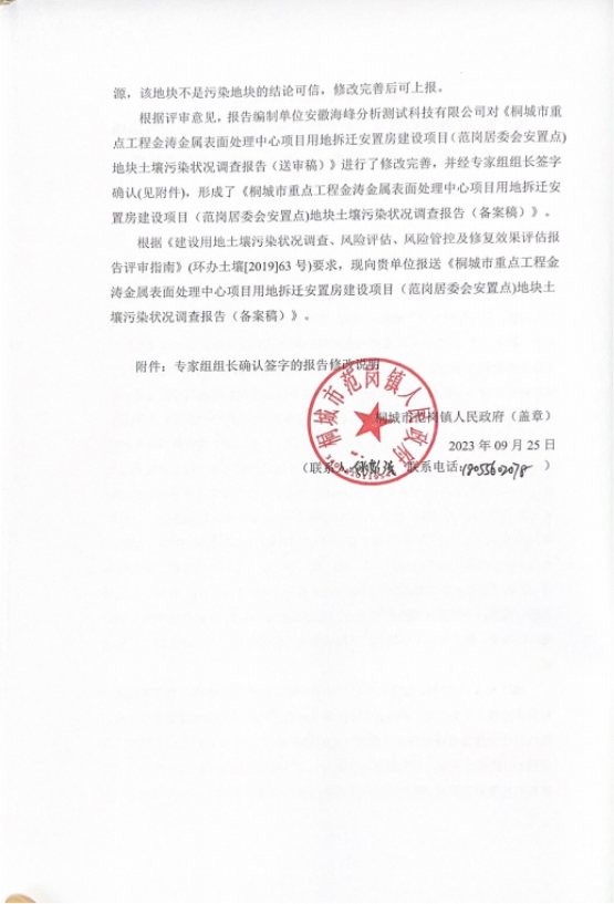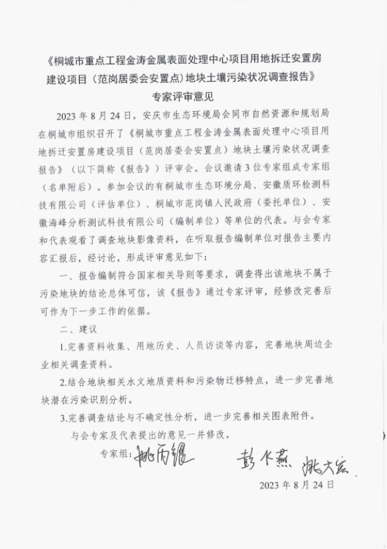 鉴于此,2023年7月,桐城市范岗镇人民政府委托安徽海峰分析测试科技有限公司对该地块进行土壤污染状况调查工作。2023年7月4月,安徽海峰分析测试科技有限公司开始进行现场踏勘和资料收集,并开展了人员访谈、航拍工作及现场快速检测工作。在上述工作的基础上完成《桐城市重点工程金涛金属表面处理中心项目用地拆迁安置房建设项目(范岗居委会安置点)地块土壤污染状况调查报告》的编制。