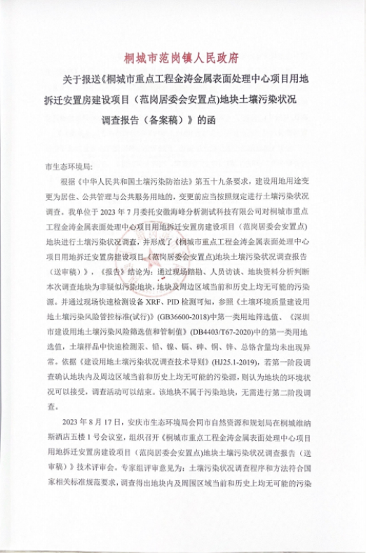 项目名称:桐城市重点工程金涛金属表面处理中心项目用地拆迁安置房建设项目(范岗居委会安置点)地块土壤污染状况调查报告