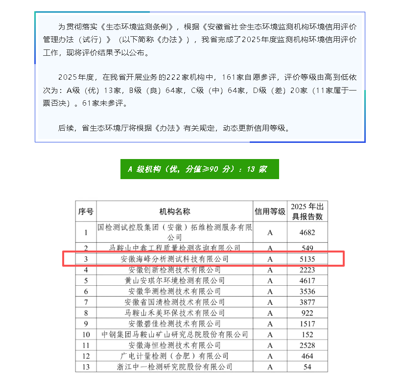 热烈祝贺我司在2025年度监测机构环境信用评价工作中荣获“A级”!